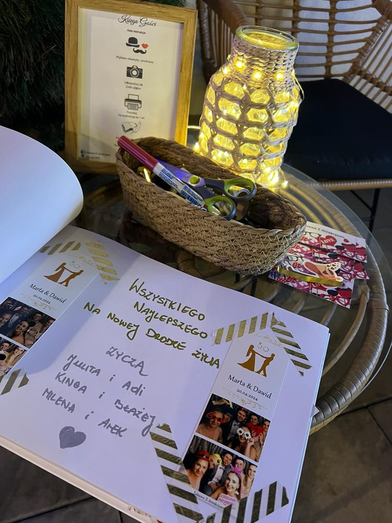 + Księga gości i dodatki (pisaki, klej, taśmy ozdobne, stempelki, naklejki),