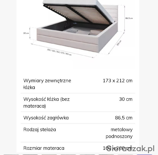 Podnoszony stelaż metalowy- Stelaż wspierany jest mechanizmem podnoszenia - dwa siłowniki gazowe. Posiada brzozowe sprężynujące listwy
