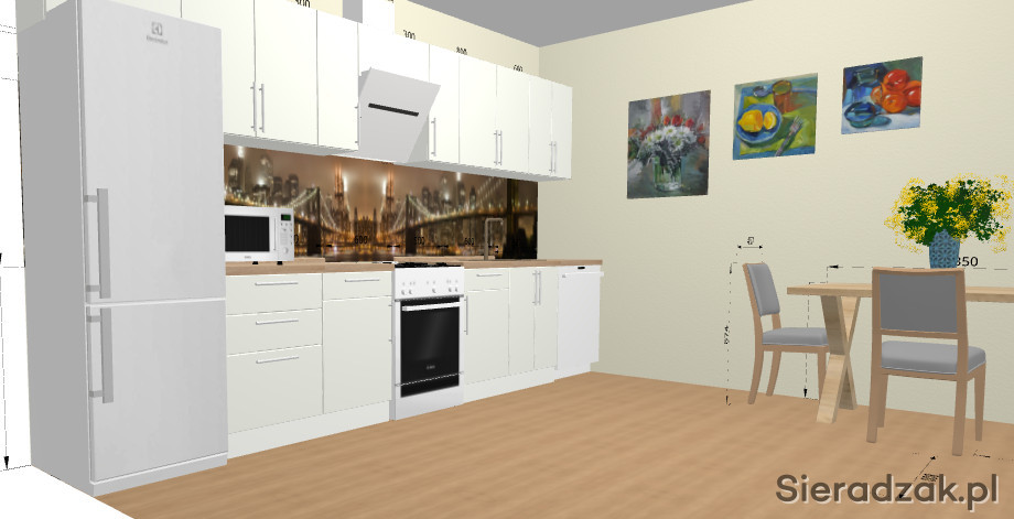 Po lewej stronie znajduje się lodówka 190*60*60. Po prawej stronie znajduje się zmywarka o głębokości 50 cm i szerokości 60 cm