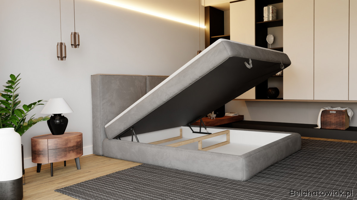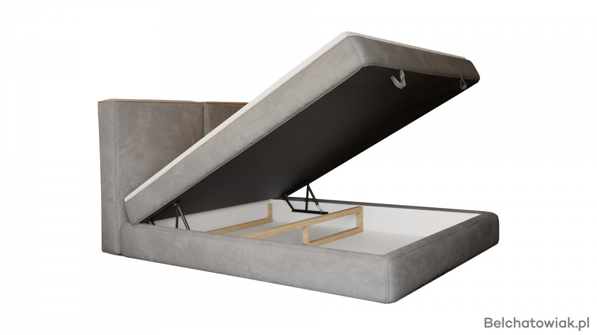Wbudowany, pojemny schowek na pościel umożliwia wygodne przechowywanie kołder, poduszek czy koców. To rozwiązanie pozwala zachować porządek i zaoszczędzić miejsce w sypialni.