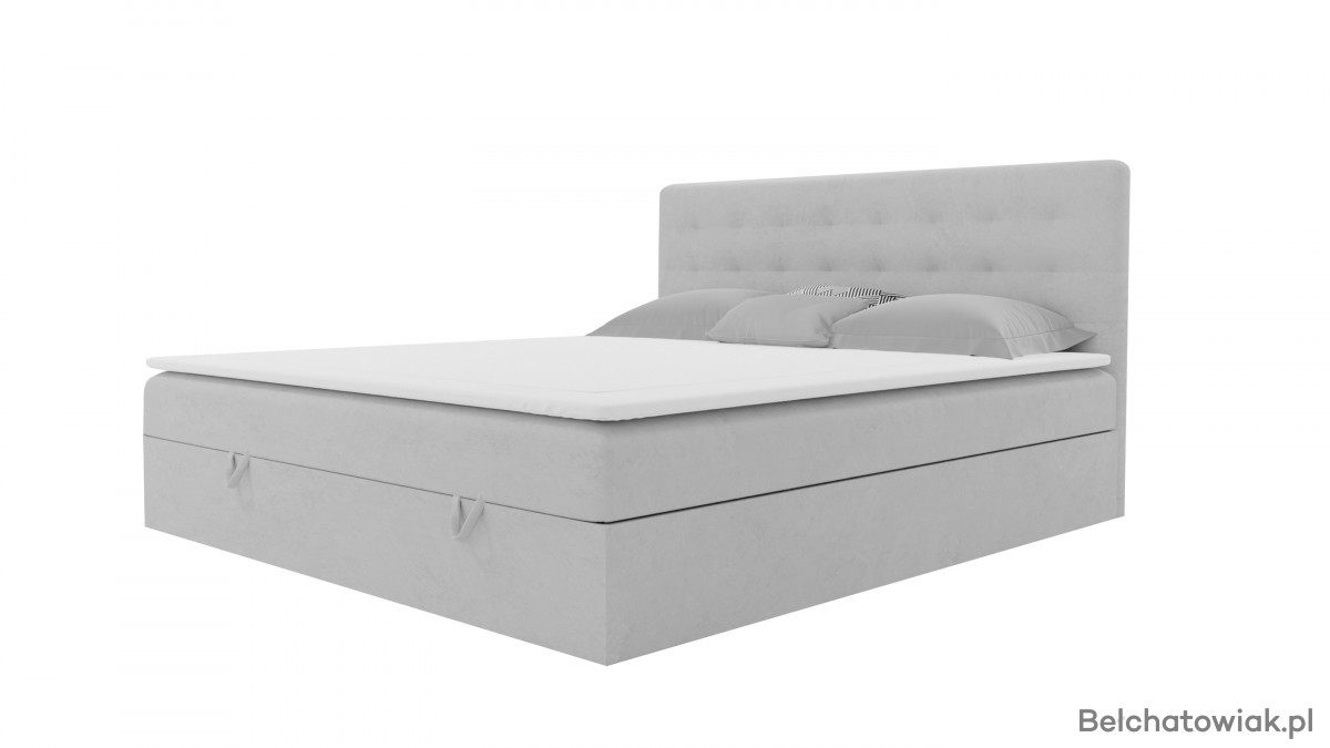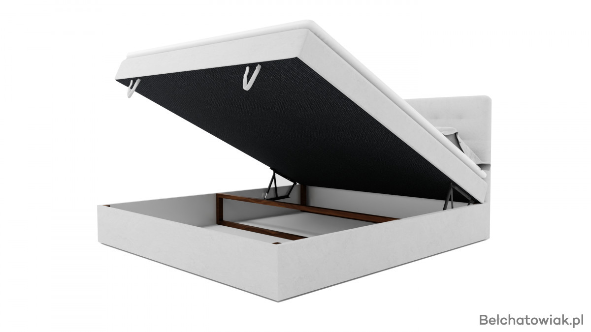 Dolna część łóżka skrywa pojemnik na pościel, idealny do przechowywania dodatkowych koców, poduszek i pościeli. Łatwy dostęp i wygodne otwieranie pojemnika ułatwiają utrzymanie porządku w sypialni.
